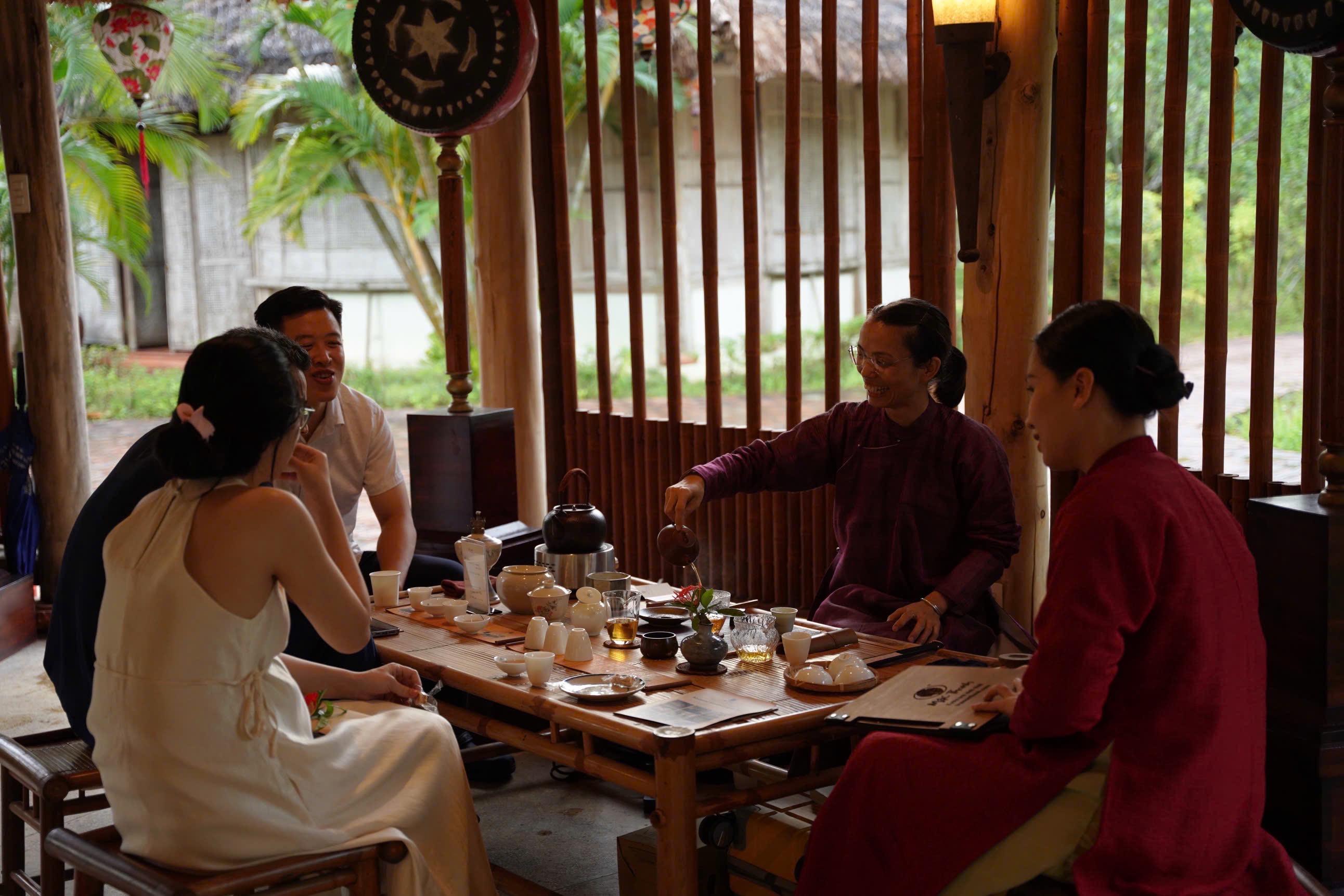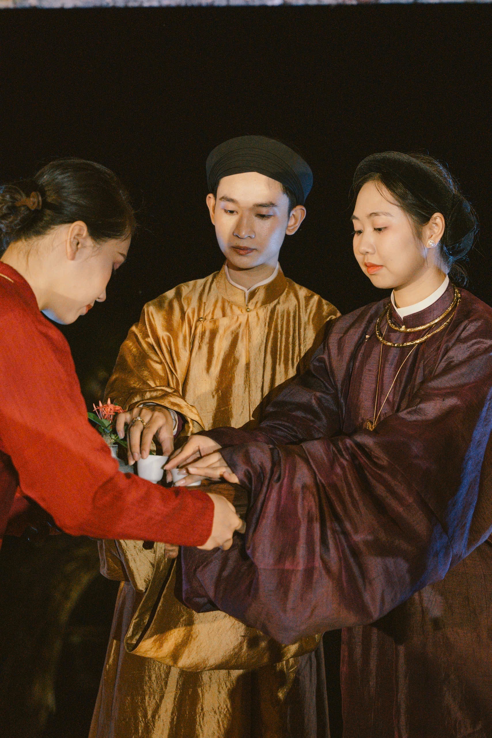 Trong văn hóa Việt Nam, trà có một vai trò quan trọng trong giao tiếp xã hội, cùng các nghi lễ tín ngưỡng, cưới xin, thờ cúng. Trong hoạt cảnh lễ cưới, chén trà lại được tiếp nối vai trò quan trọng đó. Trà nương chuẩn bị chén trà lễ cho ngày đặc biệt của cô dâu chú rể. Lấy cảm hứng từ nghi lễ uống rượu giao bôi thời các cụ, chén trà được hai người cùng uống để thể hiện sự hòa hợp, nguyện ước trọn đời bên nhau.