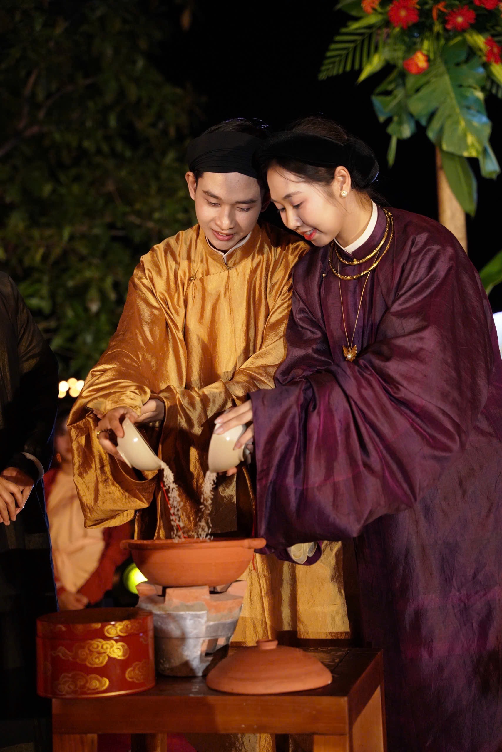 Đoạn kết của phần nghi lễ, cô dâu chú rể cùng nhau góp gạo vào nồi đất, cùng nấu bữa cơm đầu tiên. Hành động ấy tượng trưng cho việc chung tay dựng xây mái ấm, từ hạt gạo nhỏ bé đến đời sống gia đình trọn vẹn.