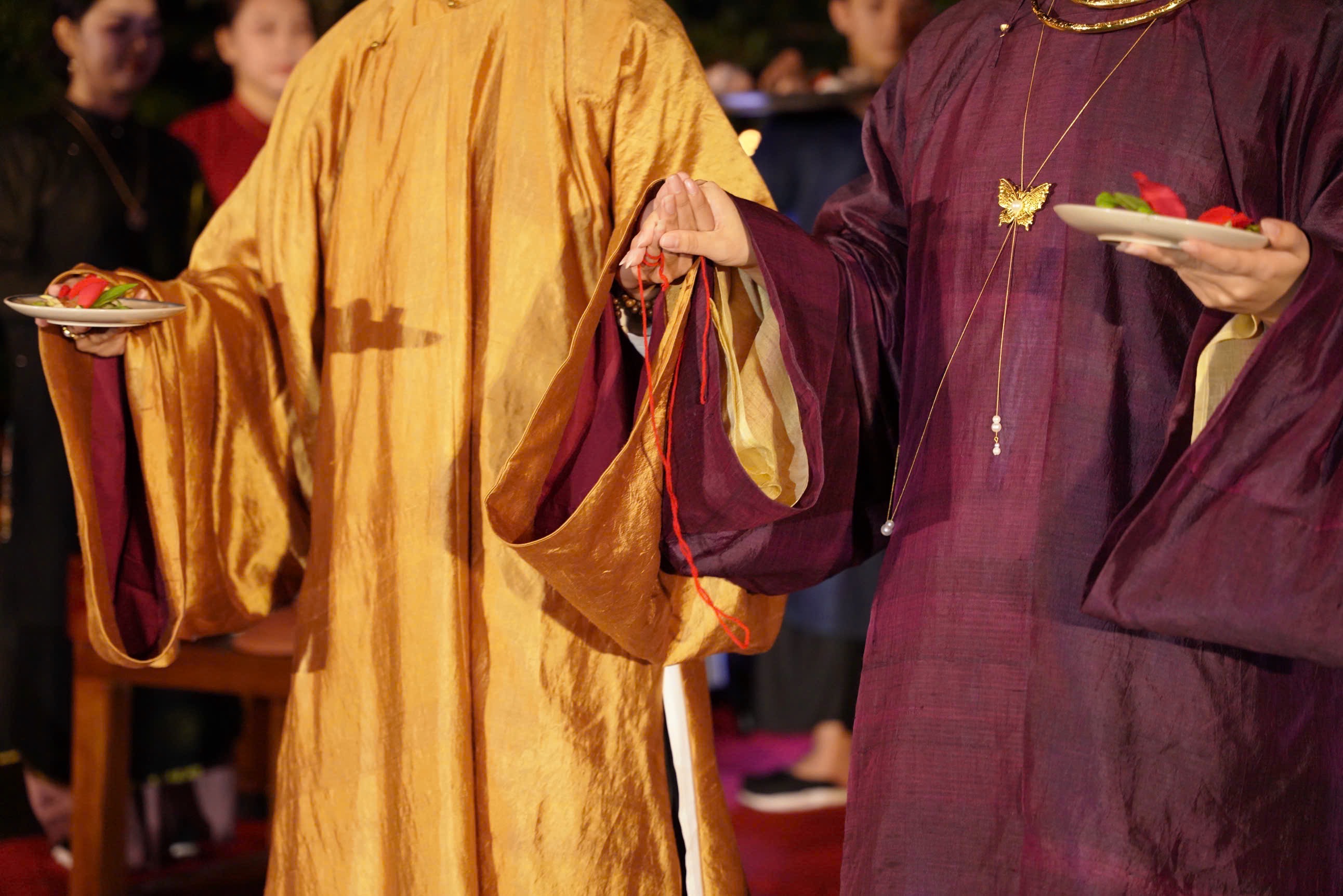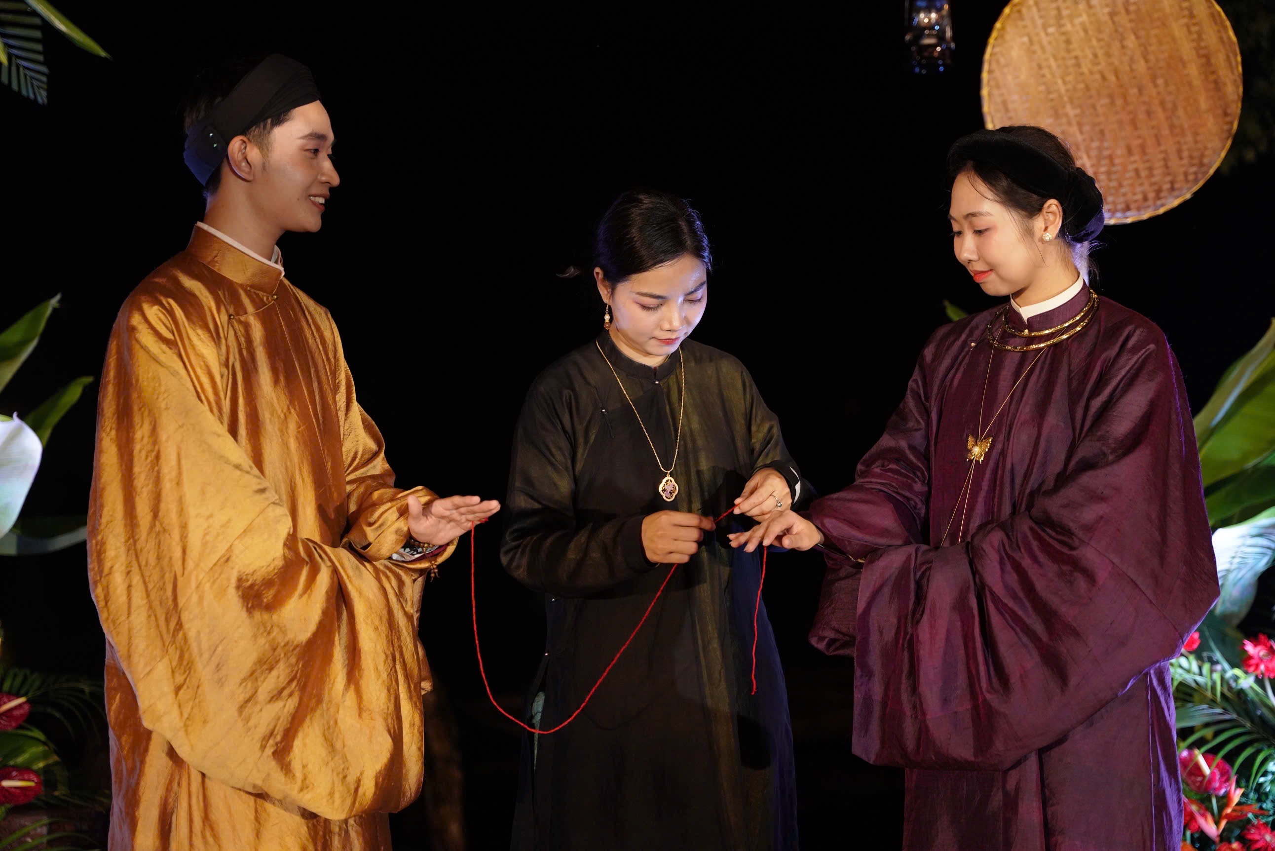 Trong đám cưới xưa thường có nghi lễ tế tơ hồng để tạ ơn ông Tơ bà Nguyệt đã xe duyên vợ chồng. Từ nghi lễ này, chúng mình tạo nên nghi thức buộc chỉ tơ hồng cho cô dâu chú rể. Bà mối ở lễ cưới có thể là bạn thân chung của cặp đôi, hoặc người đã kết nối cho 2 người gặp nhau thuở ban đầu. Nhờ sự kết nối đó, bà mối xe tơ hồng kết duyên cho cô dâu chú rể qua sợi chỉ đỏ, như hiện thực hóa sự kết nối chặt chẽ của hai con người.