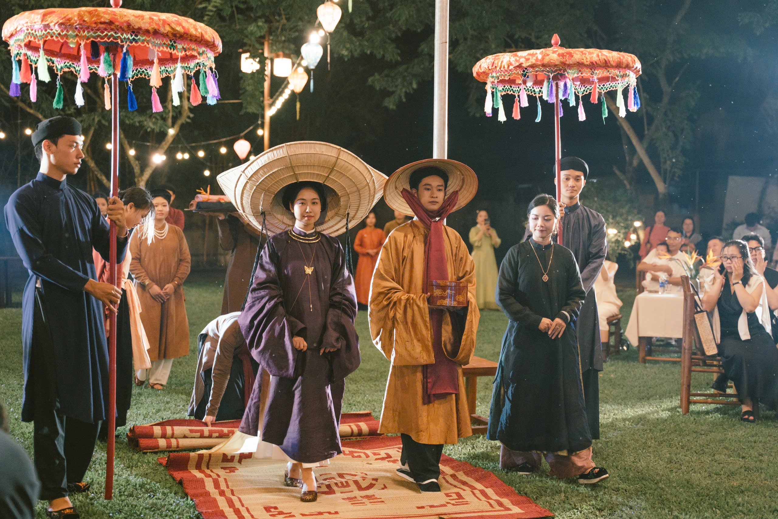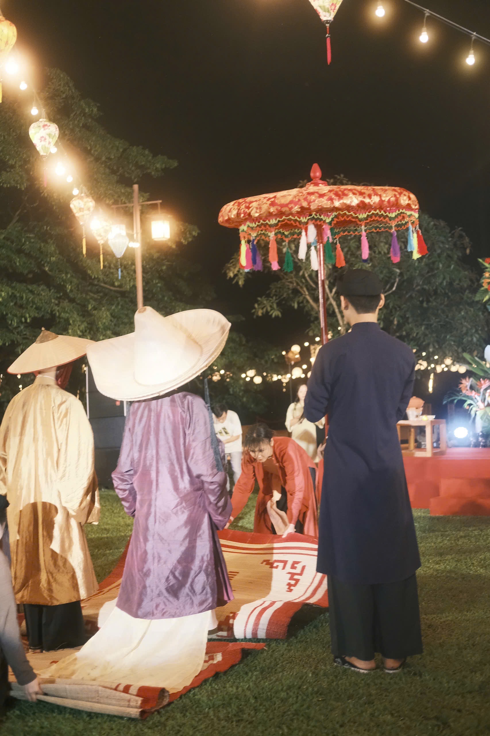 Lấy cảm hứng từ nghi lễ xưa, cô dâu chú rể bước đi trên những tấm chiếu hoa được trải trên đường. Từng nhịp bước trên chiếu hoa như một hành động ý nhị, nâng niu cô gái trong lễ cưới, như nhịp bước vào cuộc sống nên vợ nên chồng.