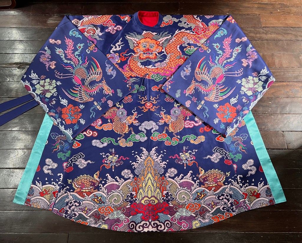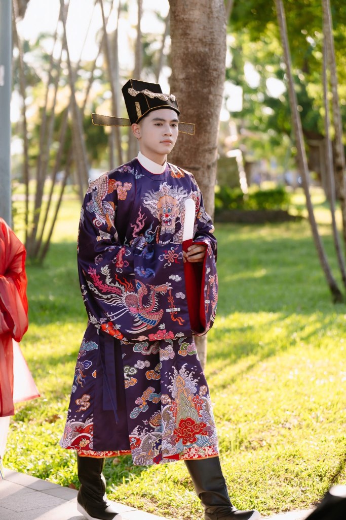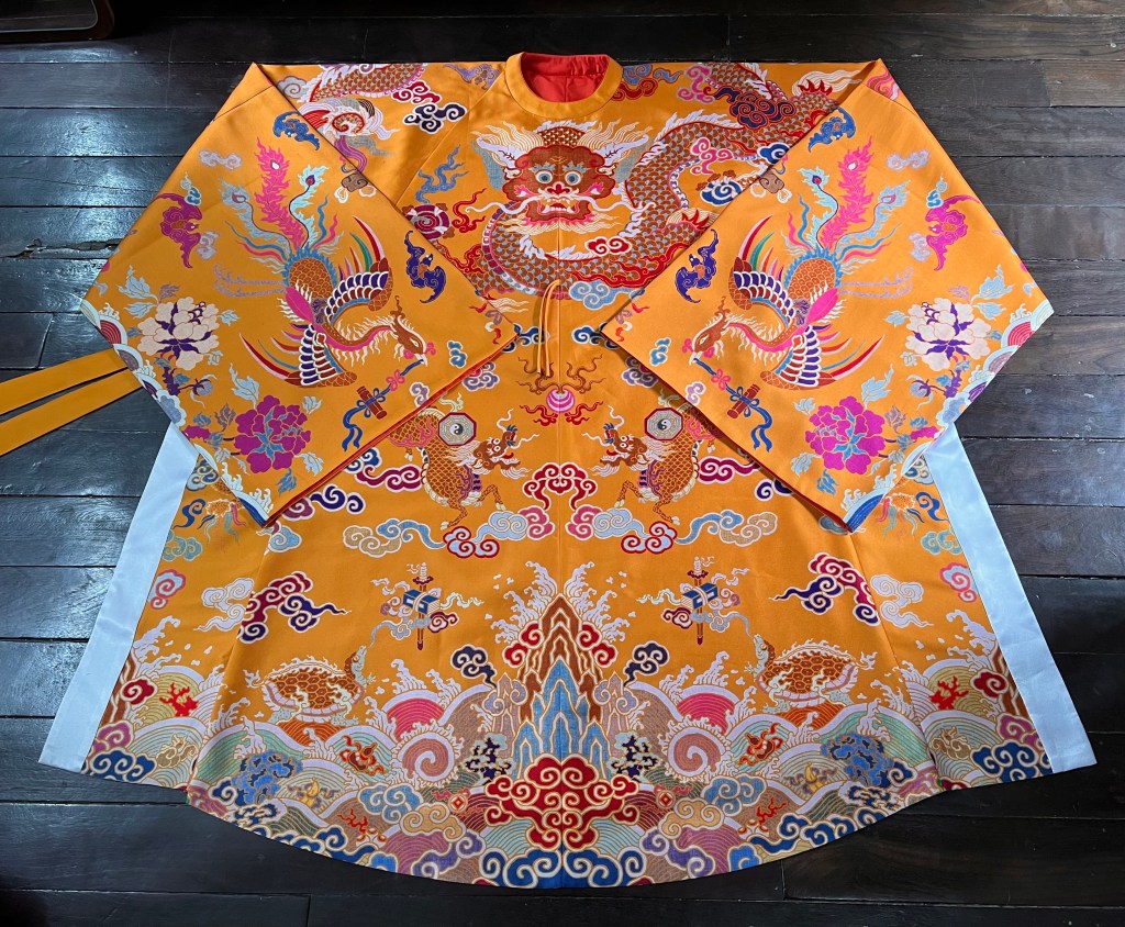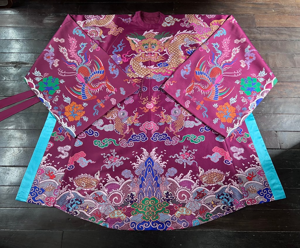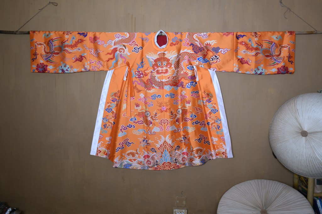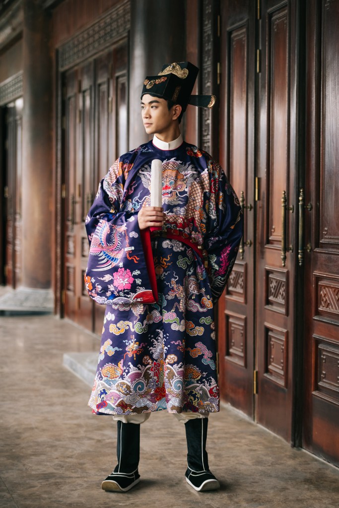 Dạng áo bào theo lối viên lĩnh (áo cổ tròn), trên áo được dệt hình con mãng (rồng 4 móng). Ở phía hông áo có 2 “cánh” nhô lên cao được gọi là “phú hậu” (dân gian hay gọi là “cánh diều”) dùng để che chỗ xẻ tà.