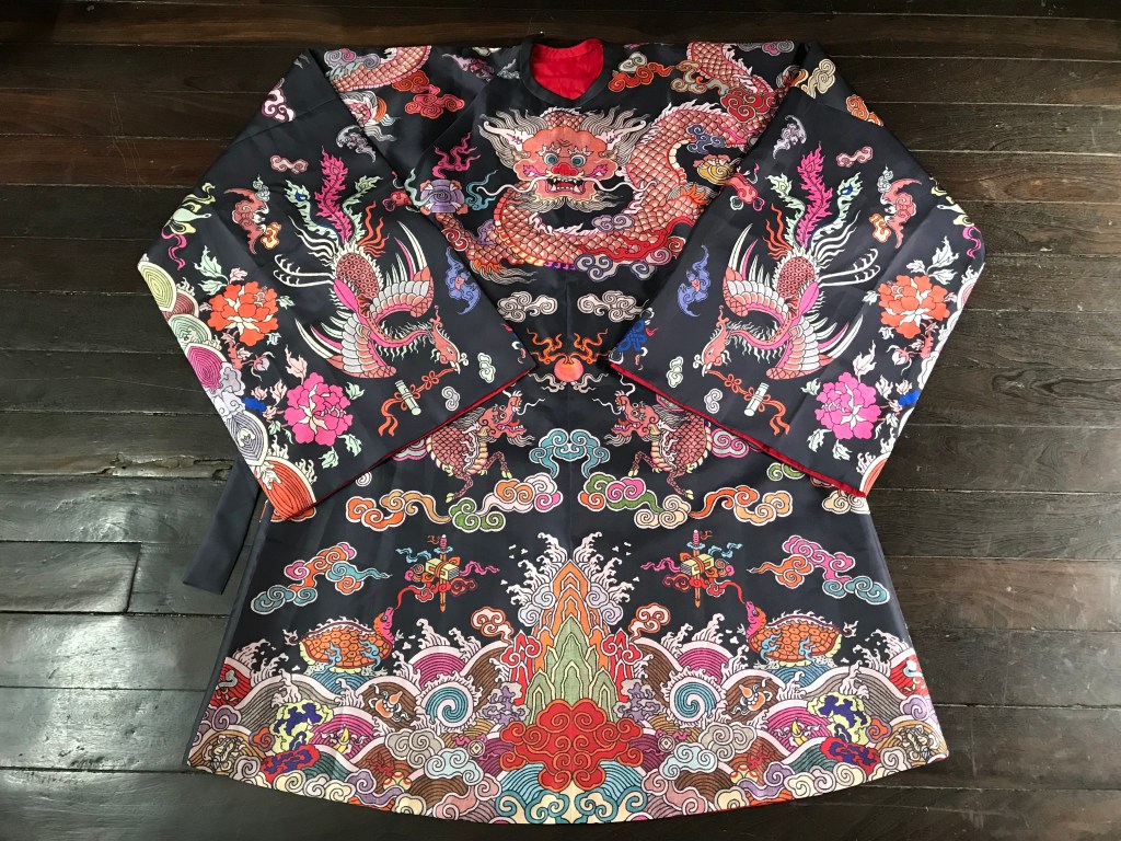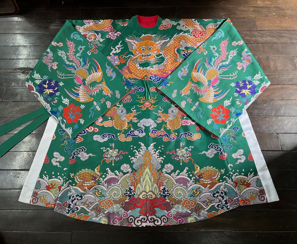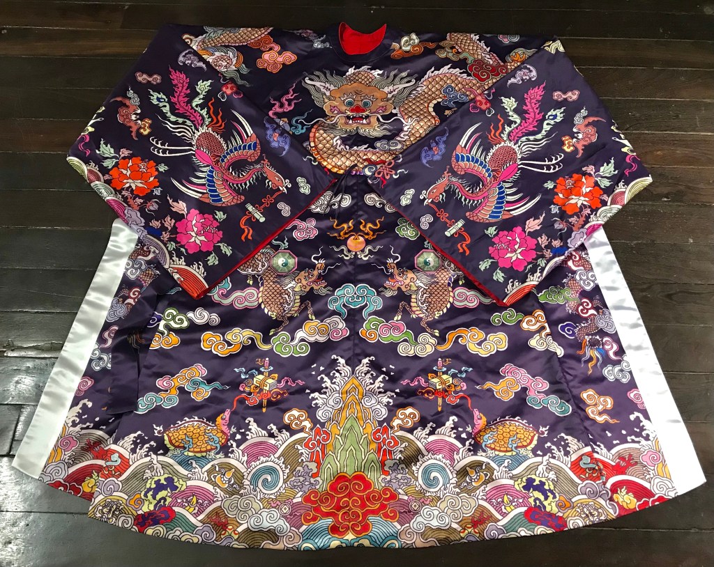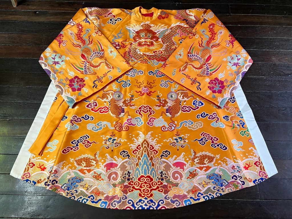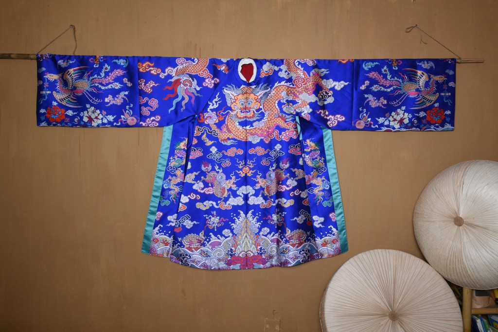 Dạng áo bào theo lối viên lĩnh (áo cổ tròn), trên áo được dệt hình con mãng (rồng 4 móng). Ở phía hông áo có 2 “cánh” nhô lên cao được gọi là “phú hậu” (dân gian hay gọi là “cánh diều”) dùng để che chỗ xẻ tà.