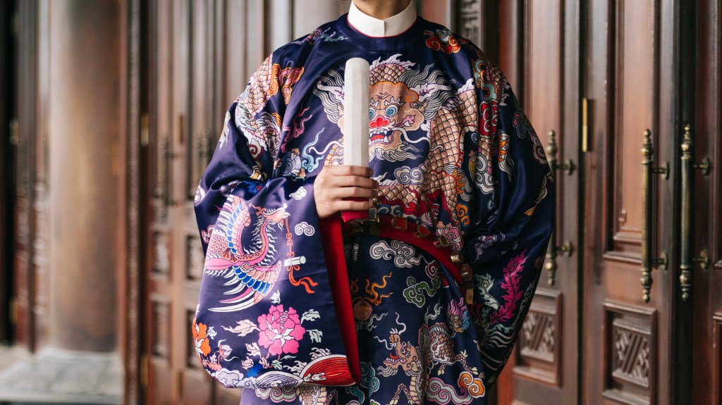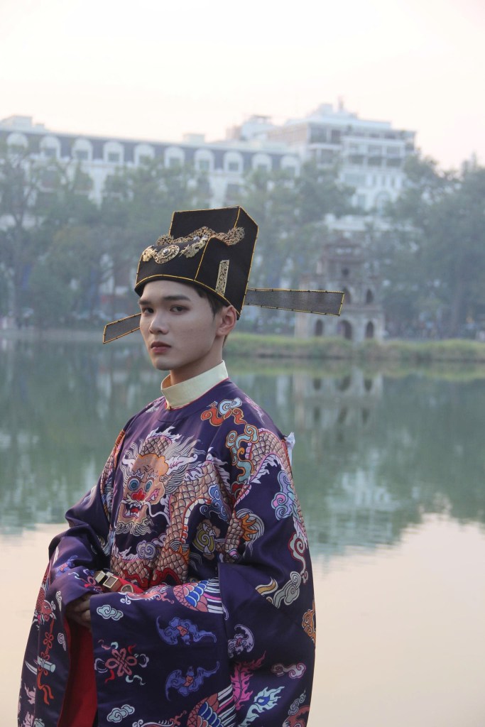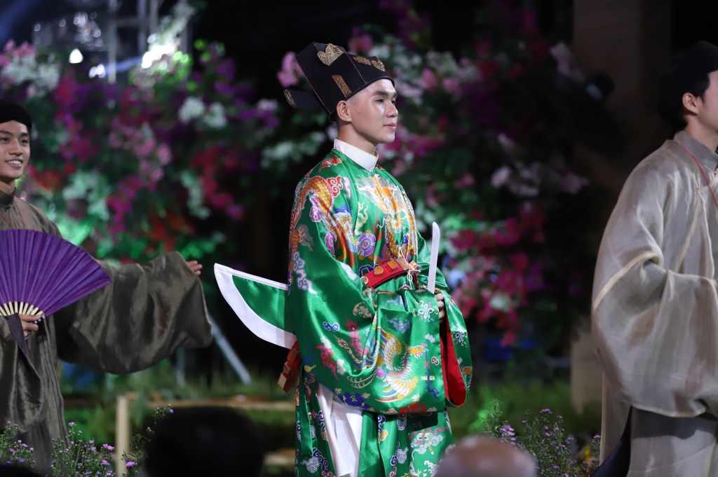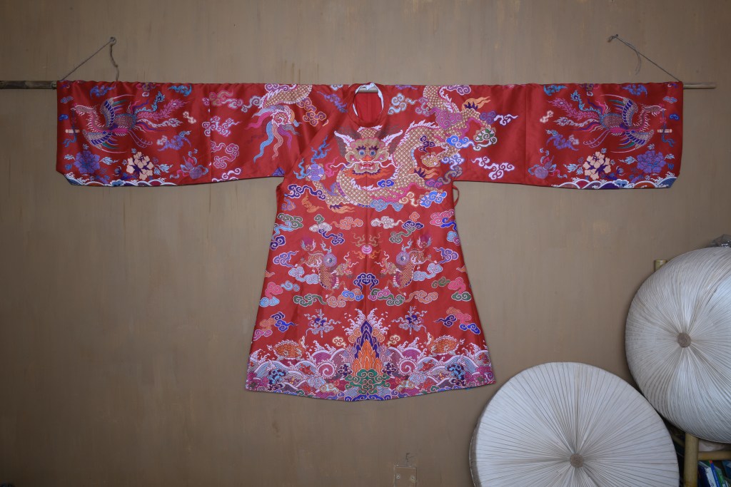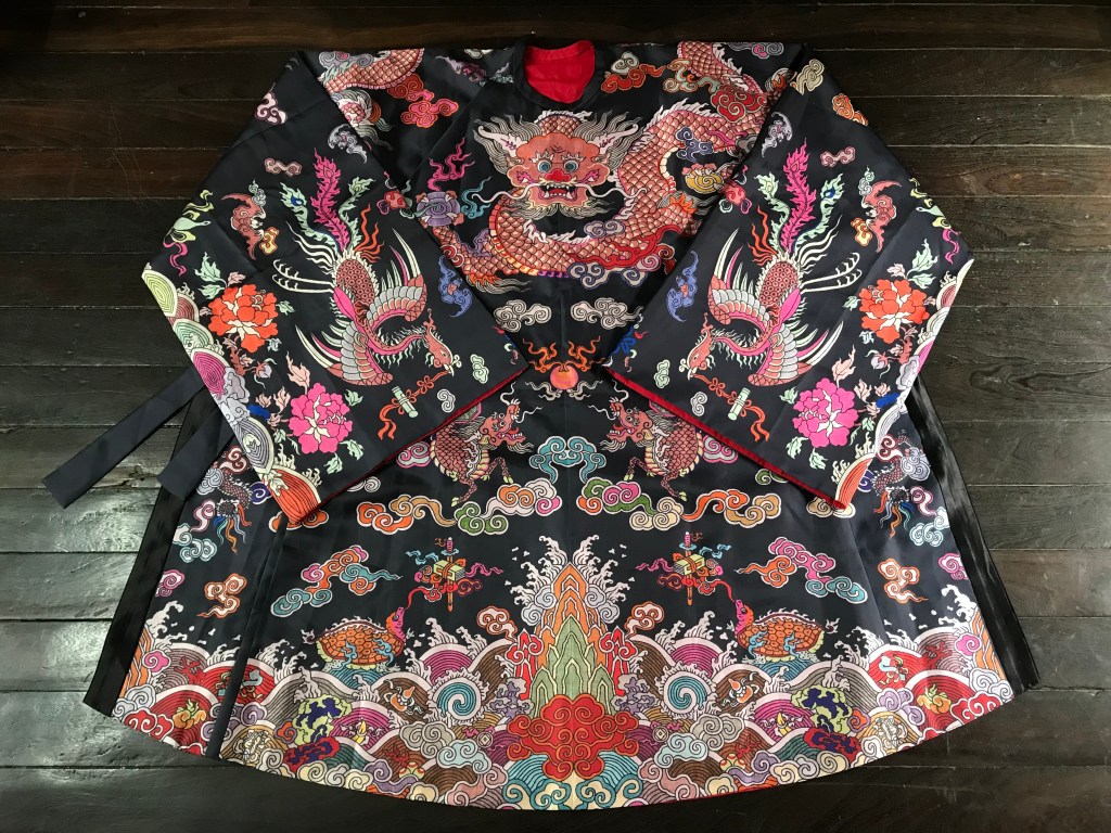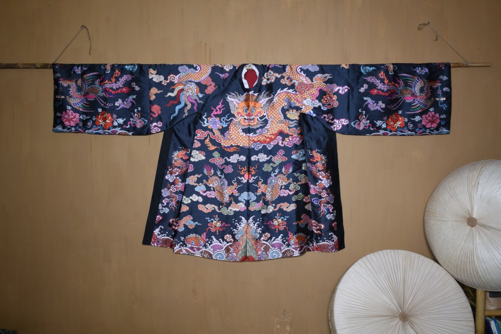 Dạng áo bào theo lối viên lĩnh (áo cổ tròn), trên áo được dệt hình con mãng (rồng 4 móng). Ở phía hông áo có 2 “cánh” nhô lên cao được gọi là “phú hậu” (dân gian hay gọi là “cánh diều”) dùng để che chỗ xẻ tà.