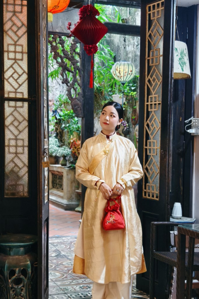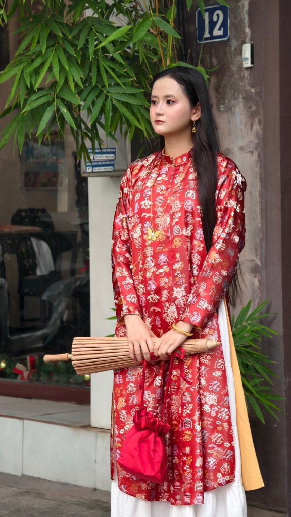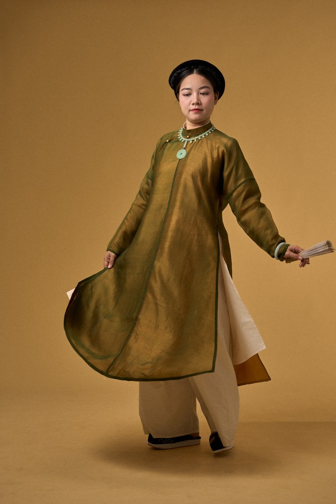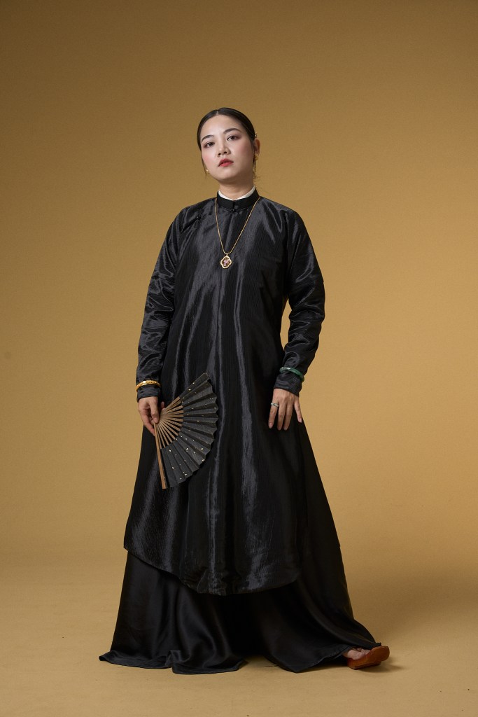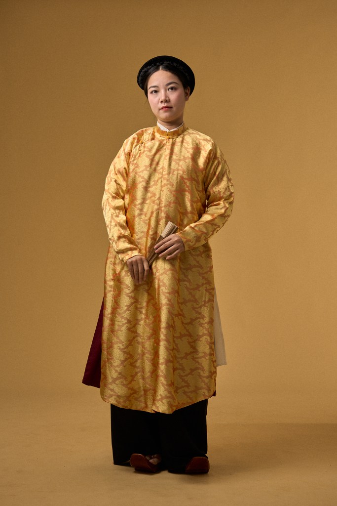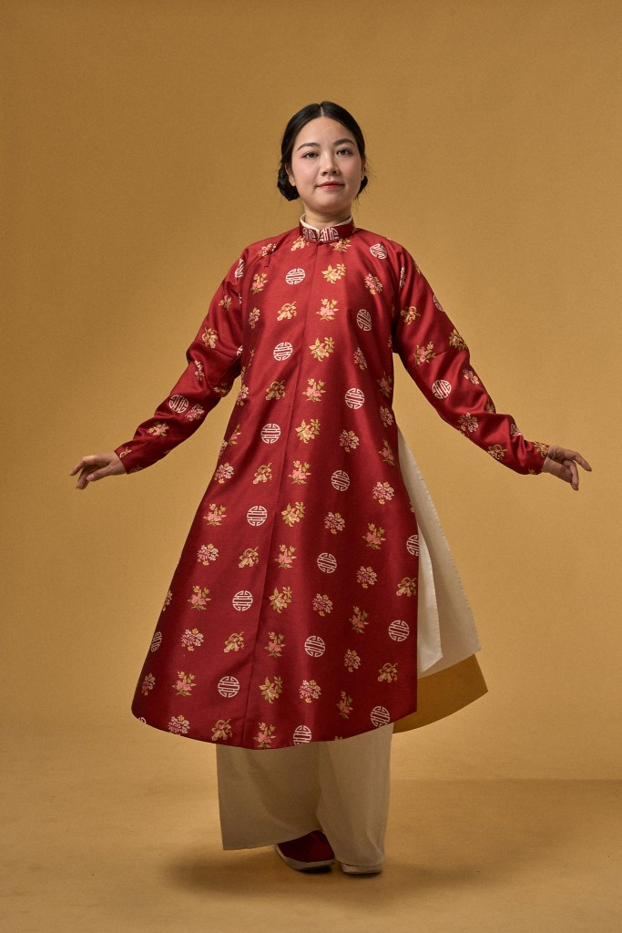 Áo có cổ đứng, cài khuy bên phải, tay ôm sát và có 5 thân (Thời xưa, công nghệ chưa phát triển, khổ vải dệt từ tơ tằm chỉ được 30 cm đến 50 cm, khi may thành tà áo phải nối với nhau, cho nên áo có tất cả là 4 vạt chính và một vạt phụ, gọi là áo 5 thân).
