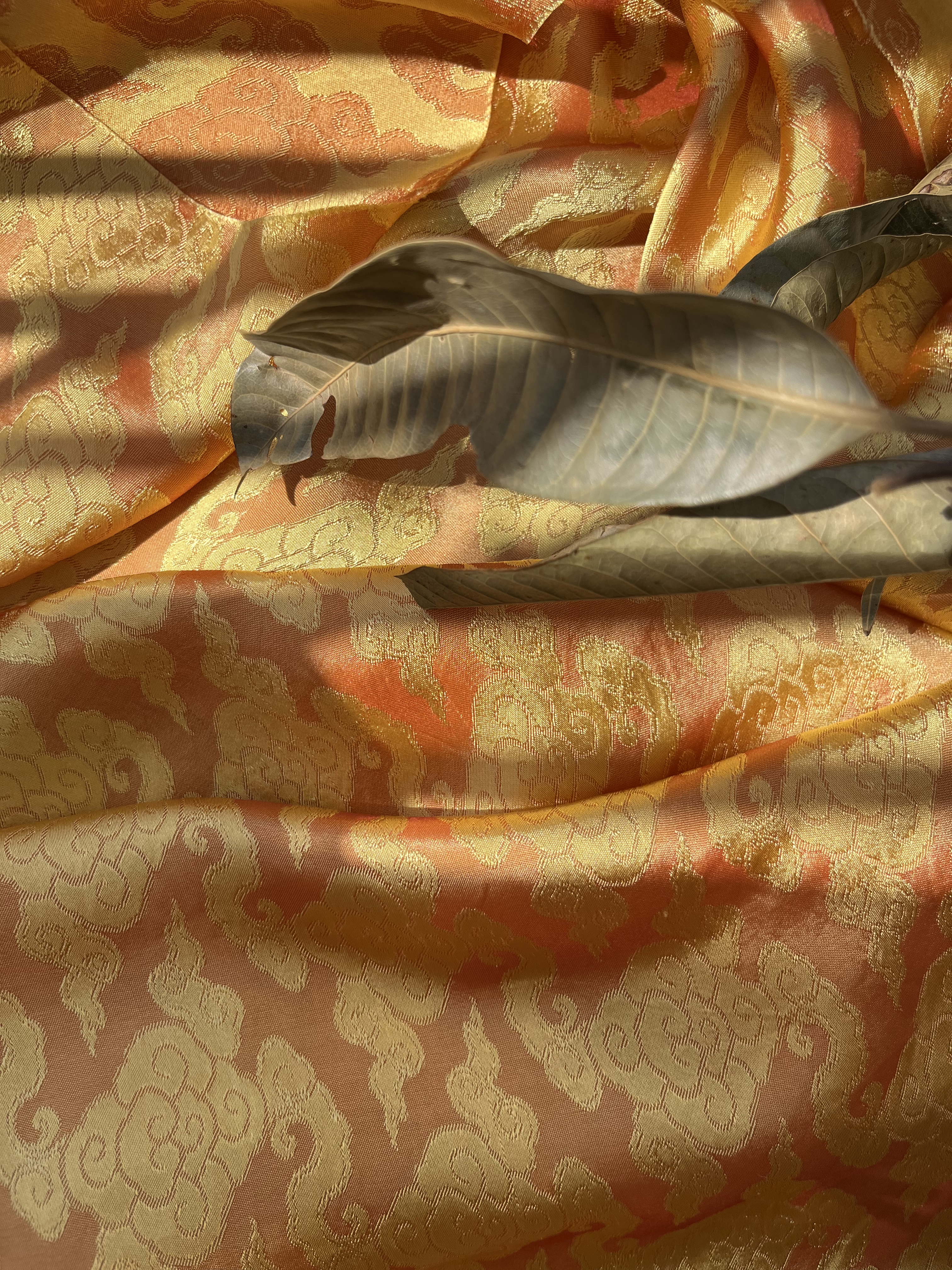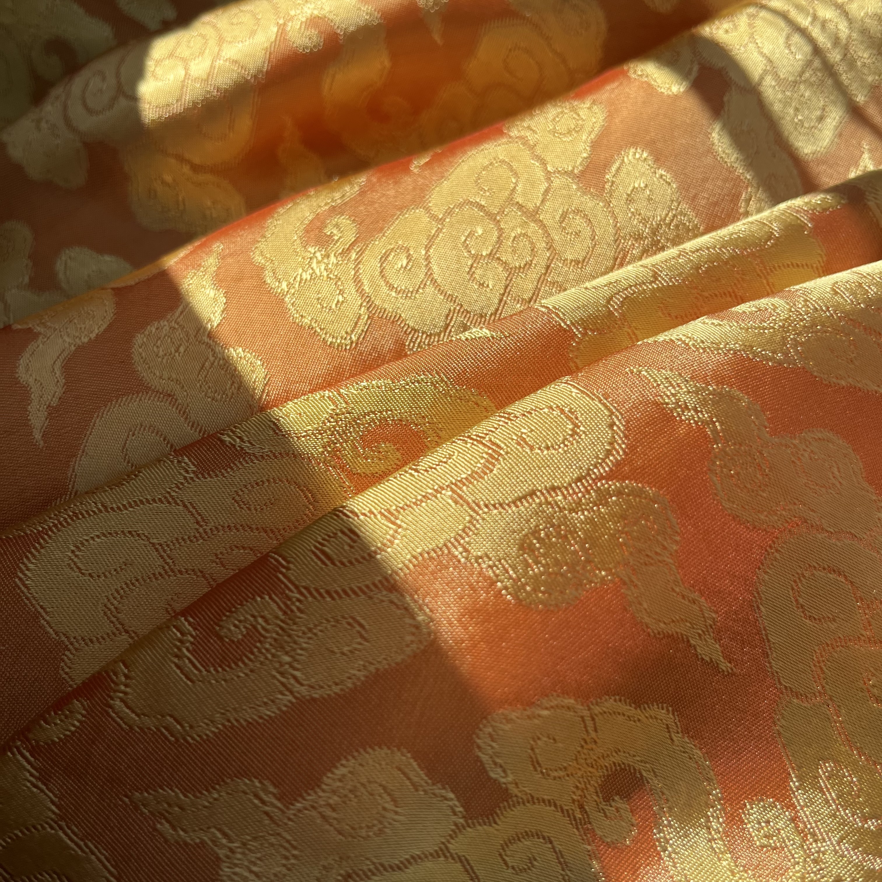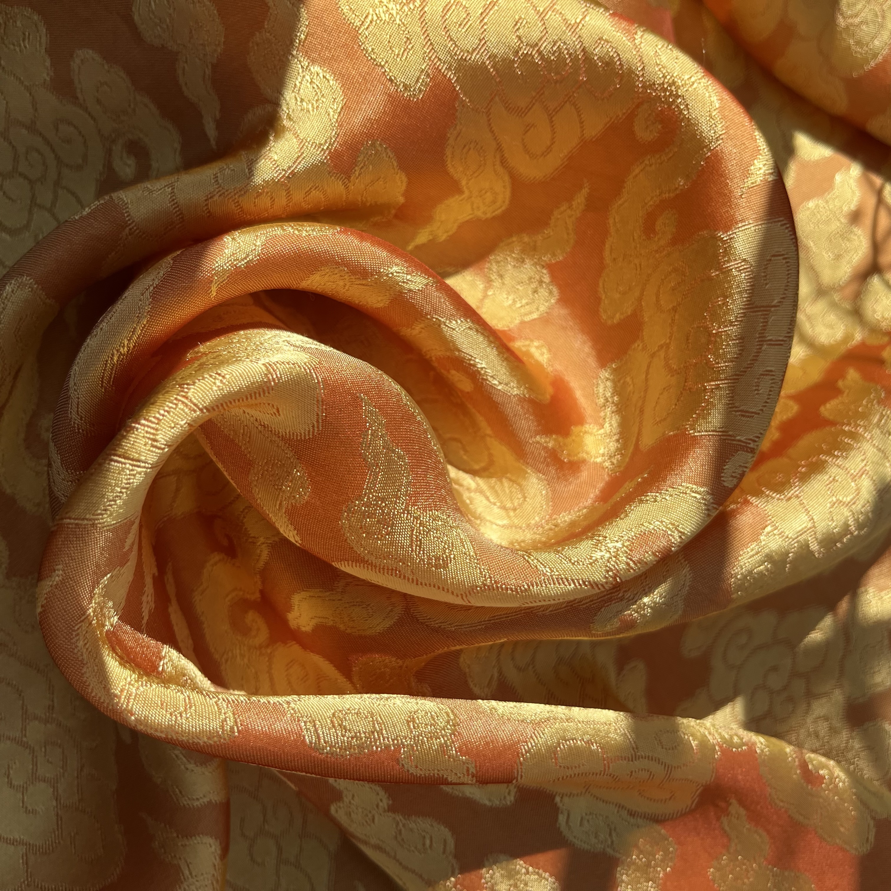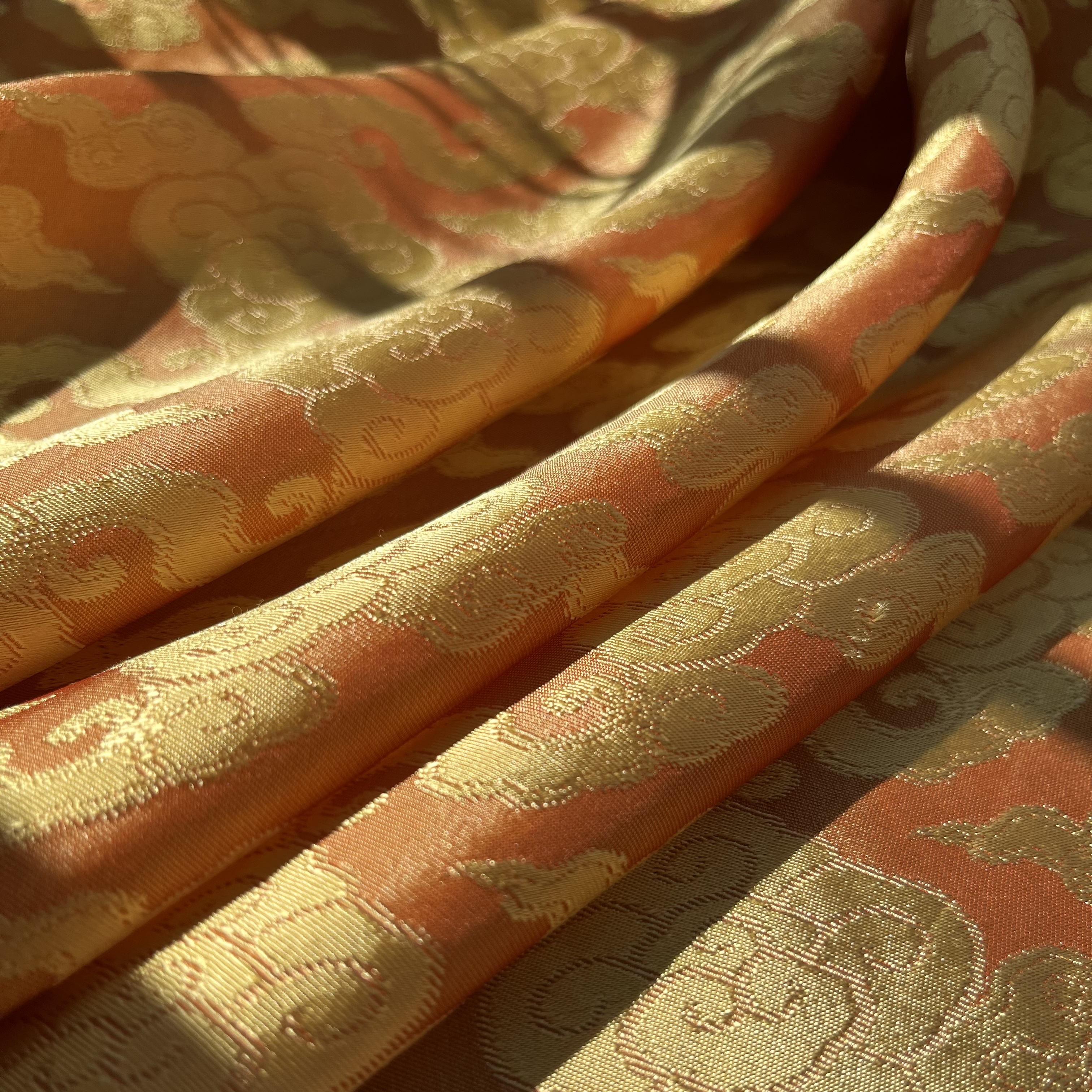 Sợi viscose là một loại sợi tổng hợp từ chất xơ của bột gỗ. Sợi rất nhẹ, mềm và bóng, có đặc tính gần như sợi tơ tằm. Vì vậy dòng satin với sợi ngang sử dụng sợi viscose vẫn có độ bóng cao, mặt vải trơn mịn, mềm mại như dòng satin tơ tằm. Vải được dệt chìm mẫu hoa văn tường vân dựa trên văn bia thế kỷ 18.