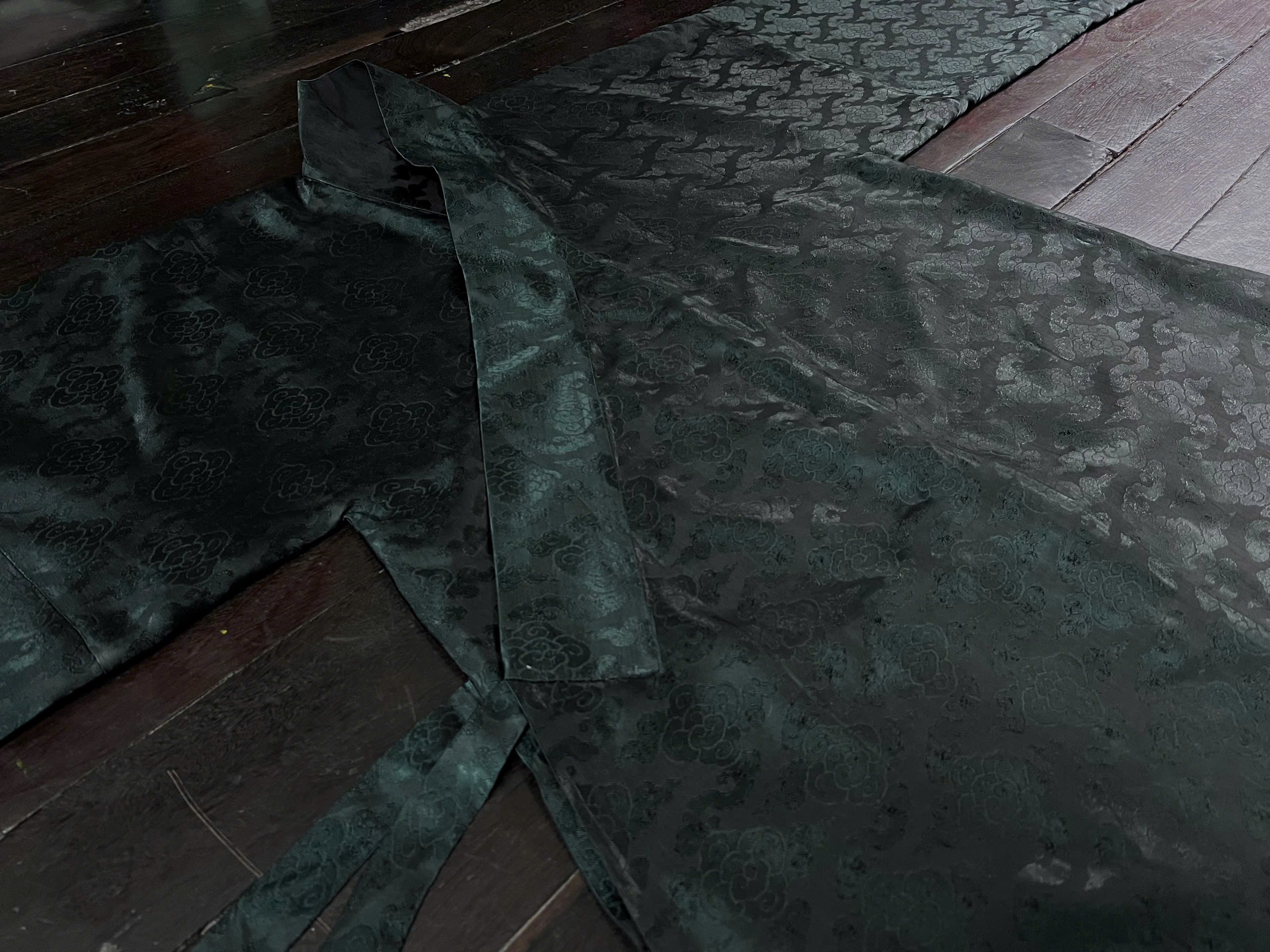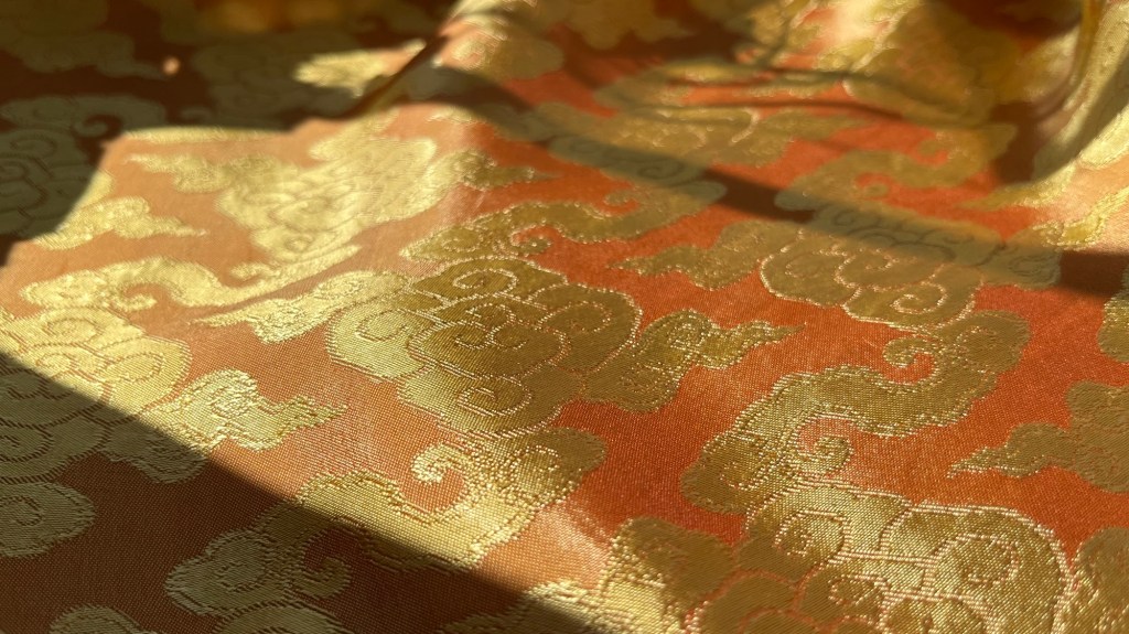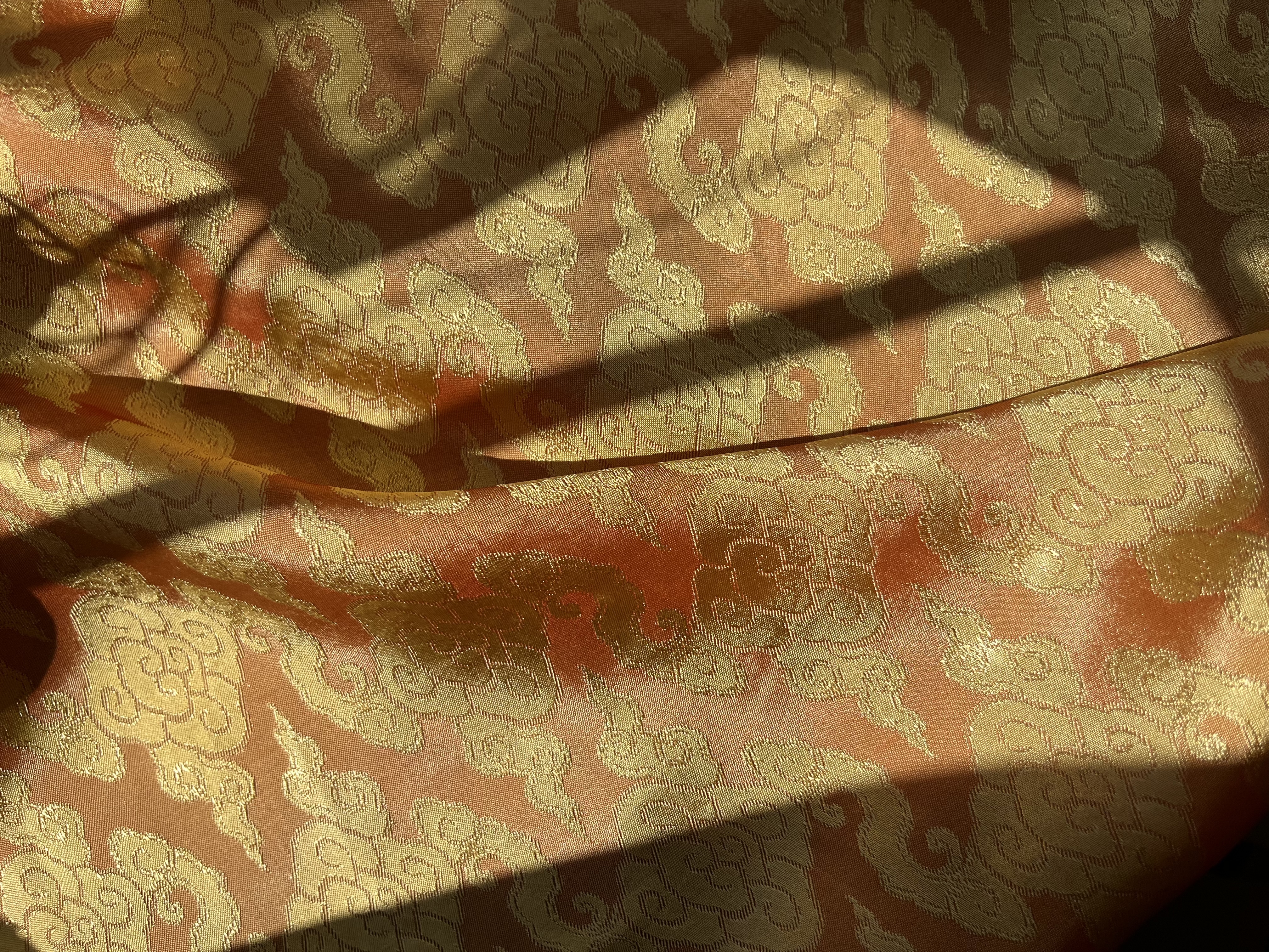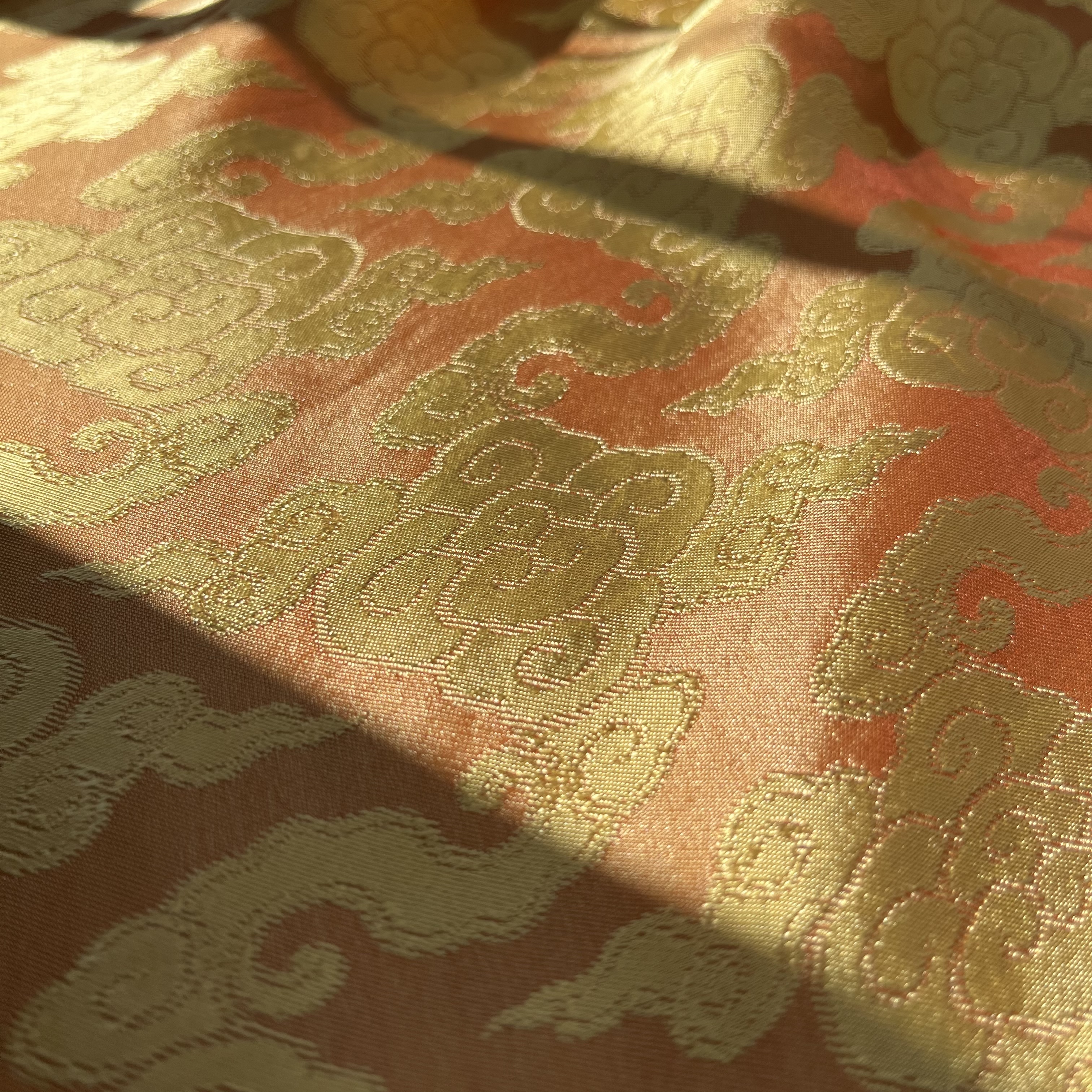 Sợi viscose là một loại sợi tổng hợp từ chất xơ của bột gỗ. Sợi rất nhẹ, mềm và bóng, có đặc tính gần như sợi tơ tằm. Vì vậy dòng satin với sợi ngang sử dụng sợi viscose vẫn có độ bóng cao, mặt vải trơn mịn, mềm mại như dòng satin tơ tằm. Vải được dệt chìm mẫu hoa văn tường vân dựa trên văn bia thế kỷ 18.