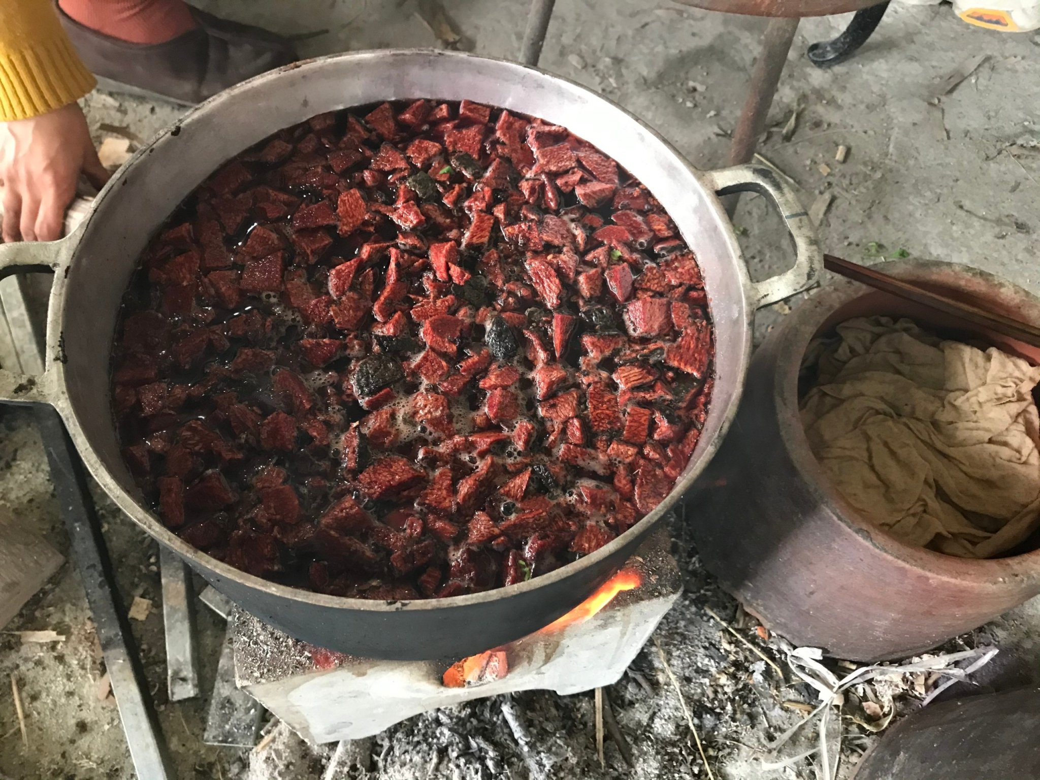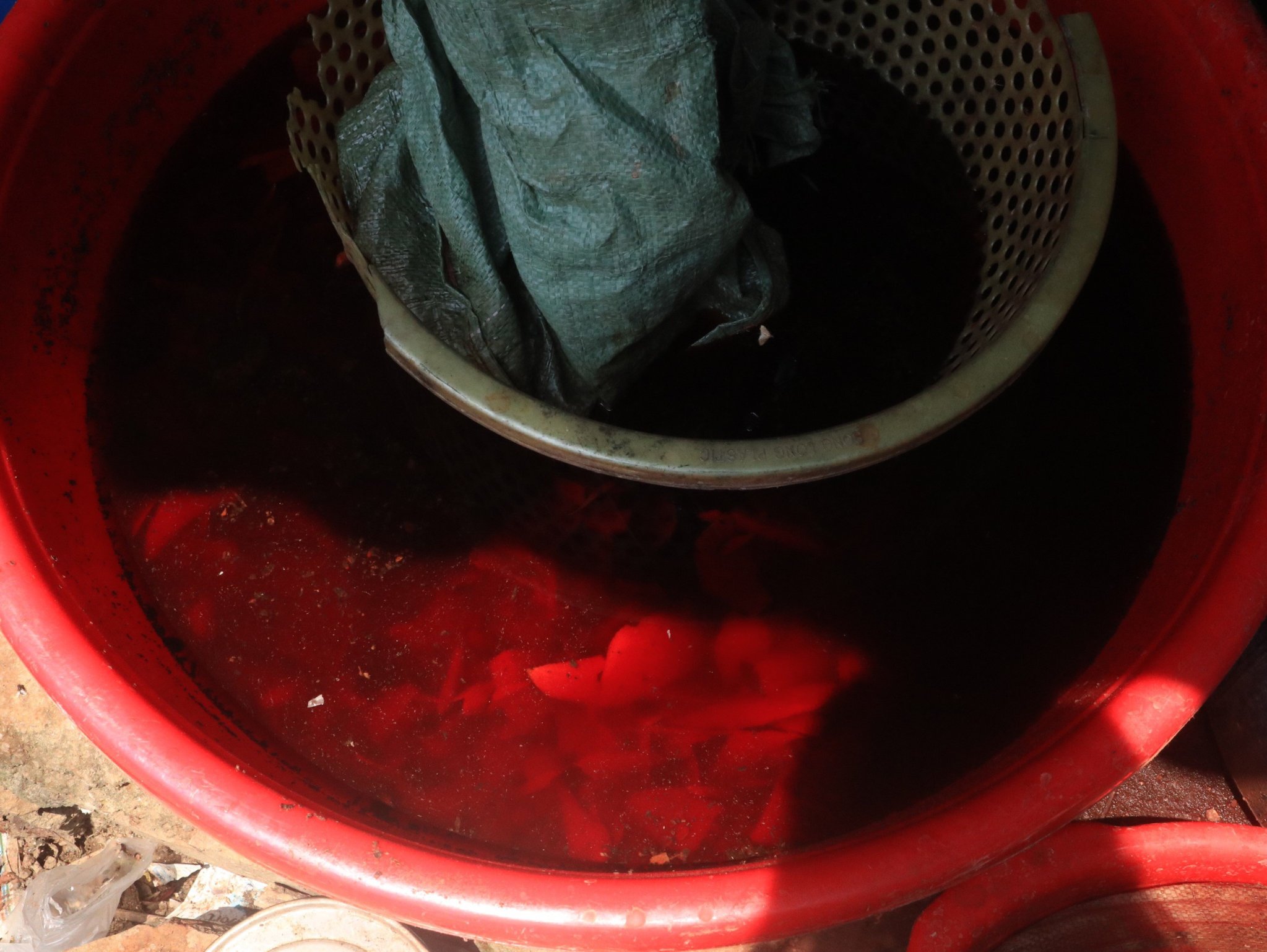 Để nhuộm củ nâu cũng cần băm nhỏ củ nâu trước để màu thoát ra được tốt hơn. Sau khi băm nhỏ thì có thể đun củ nâu lấy nước nhuộm, tuy nhiên phương pháp này thường ko làm củ nâu ra hết được màu nên chỉ sử dụng khi cần nhuộm luôn. Còn cách chiết màu tốt nhất là ngâm củ nâu với nước và ủ đó trong thời gian dài, với phương pháp này thùng nước củ nâu có thể để được cả năm không hỏng.