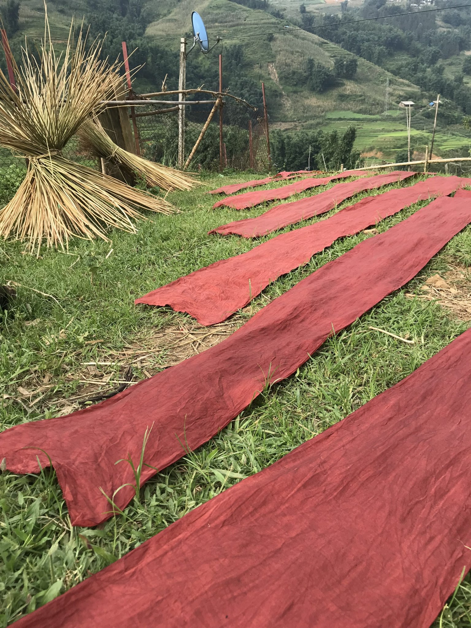 — Phơi vải dưới ánh nắng: Vải nhuộm củ nâu khi gặp nắng sẽ lên màu rất nhanh, phần không được nắng chiếu vào thì màu lại rất nhạt, vậy nên với phương pháp phơi này sẽ cần trọn ngày có nắng và trải phẳng tấm vải nhuộm củ nâu ở nơi thoáng đãng để nắng có thể chiếu đều trên bề mặt tấm vải. Mặt vải được nắng chiếu vào sẽ có màu đậm, còn mặt úp xuống sẽ có màu nhạt, nếu muốn 2 mặt đều đậm sẽ cần lật vải để 2 mặt đều được chiếu sáng trước khi vải khô.
