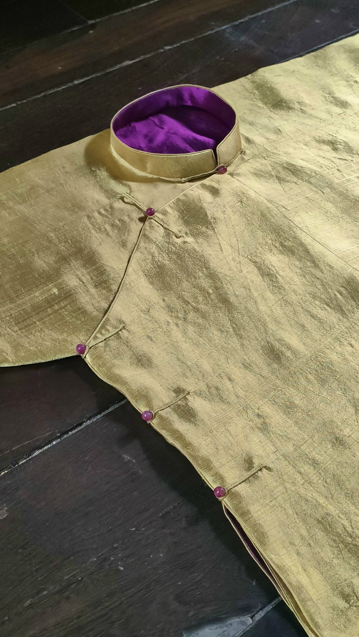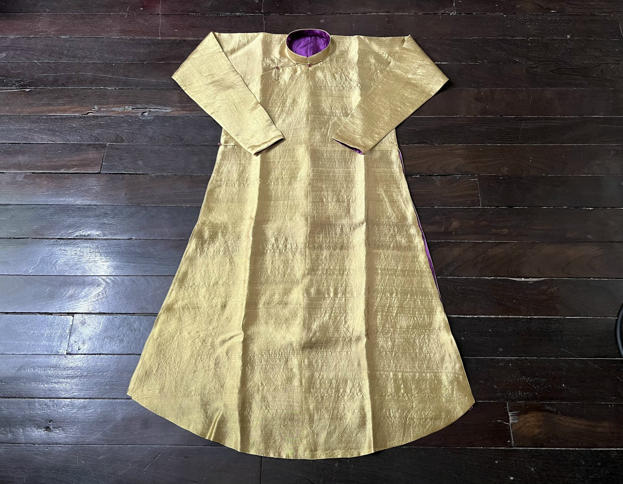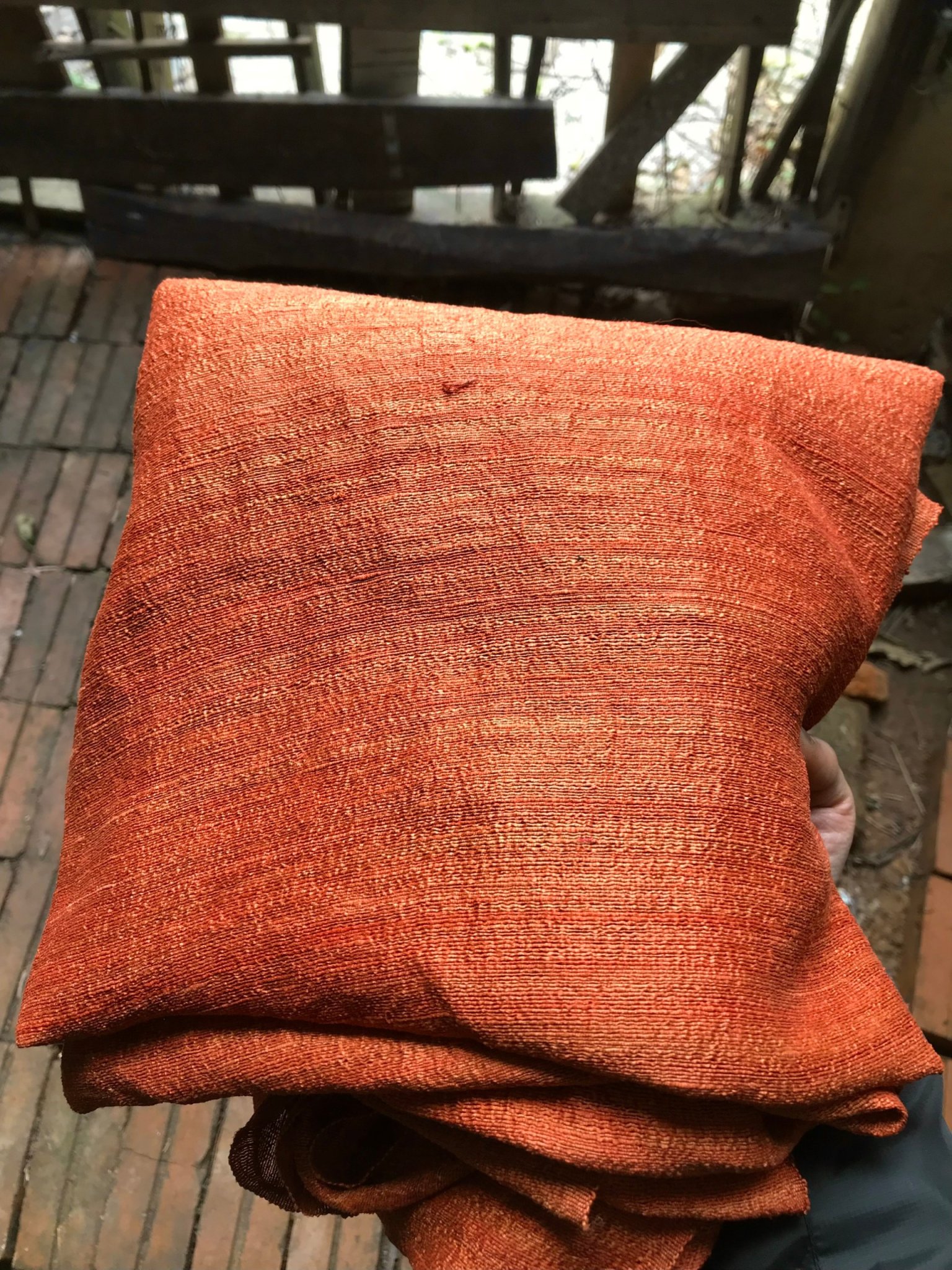 Tấm vải tơ sống được nhuộm lá bàng và muối sắt nhiều lần để được màu đen